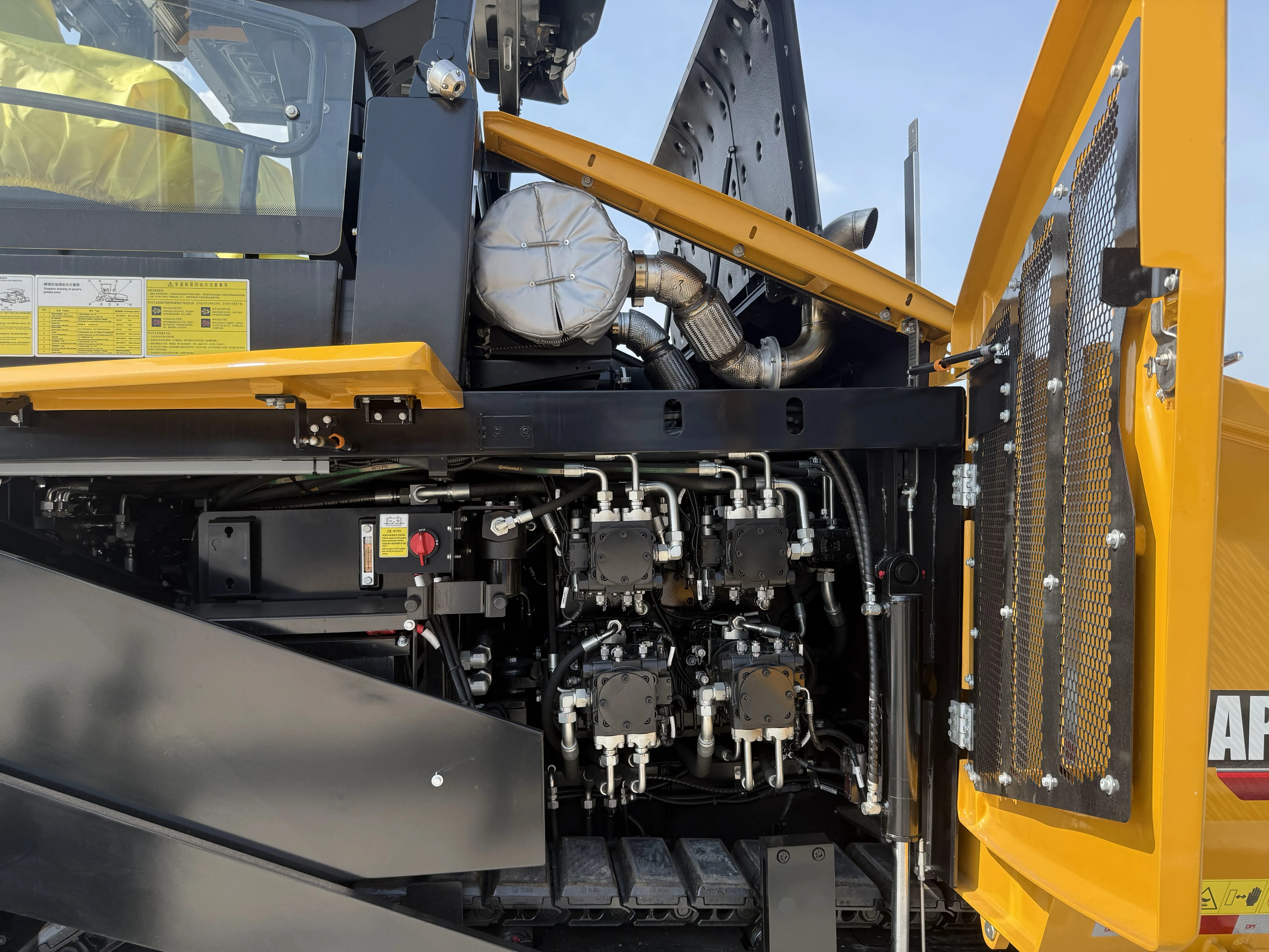 Автоматическая гидравлическая система натяжения гусеницы и кованые усиленные звенья гусеничной ленты рассчитаны на повышенные нагрузки, характерные для российских строительных объектов. Необслуживаемые ролики и гусеничные тележки с резиновыми башмаками обеспечивают минимальное воздействие на дорожное покрытие при транспортировке.